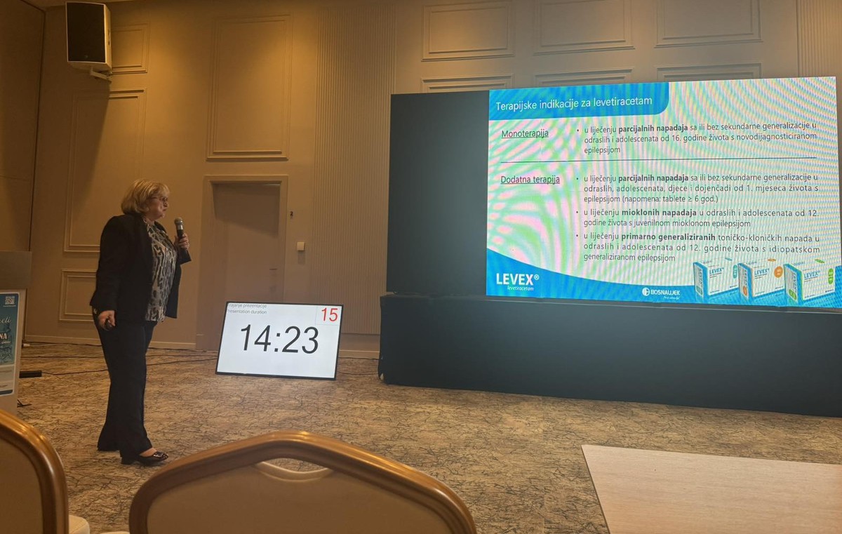 Prim. doc. dr Larisa Kovačević, spec. neuropsihijatar s Klinike za neurologiju, govorila je na temu „LEVEX® – terapija izbora kod djece i odraslih s fokalnom i generaliziranom epilepsijom", pri čemu je istakla značaj levetiracetama u liječenju parcijalnih napada sa ili bez sekundarne generalizacije kod pacijenata starijih od 16 godina.